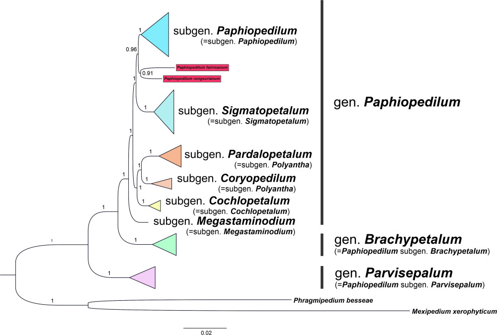 Filogeneza rodzaju Paphiopedilum uzyskana metodą wnioskowania bayesowskiego na podstawie połączonego zestawu danych niskokopijnych genów jądrowych PHYC, ACO i DEF4. Wartości prawdopodobieństwa posteriori (PP) podano nad gałęziami. Adnotacje taksonomiczne na drzewie filogenetycznym odzwierciedlają nową systematykę zaproponowaną w tym badaniu.