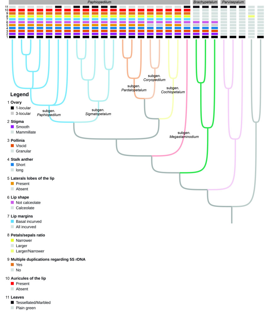 Filogeneza rodzaju Paphiopedilum uzyskana metodą wnioskowania bayesowskiego na podstawie połączonego zestawu danych niskokopijnych genów jądrowych PHYC, ACO i DEF4. Na drzrewo naniesiono kluczowe cechy użyte do taksonomicznego wyznaczenia głównych kladów. Wskazano synapomorfie morfologiczne oraz cechę cytogenetyczną „wielokrotne duplikacje 5S rDNA” (pozycja 9). Drzewo uwidacznia zarówno relacje genetyczne, jak i ewolucyjne znaczenie specyficznych cech morfologicznych, które są kluczowe dla definiowania granic taksonomicznych w obrębie rodzaju.