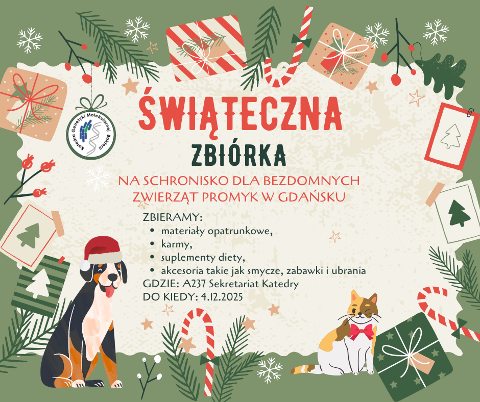Katedra Genetyki Molekularnej Bakterii ogłasza świąteczną zbiórkę dla Schroniska "Promyk" w Gdańsku.