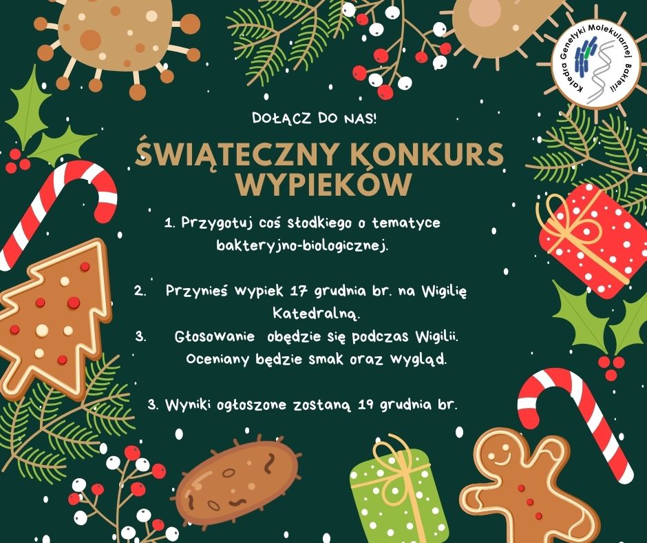 Wszystkich Pracowników, Doktorantów i Studentów Katedry Genetyki Molekularnej Bakterii zapraszamy do wzięcia udziału w świątecznym konkursie wypieków. Przygotuj coś słodkiego o tematyce związanej z zainteresowaniami Katedry i przynieś na Wigilię Katedralną 17.12.2025 o godz. 13.30.