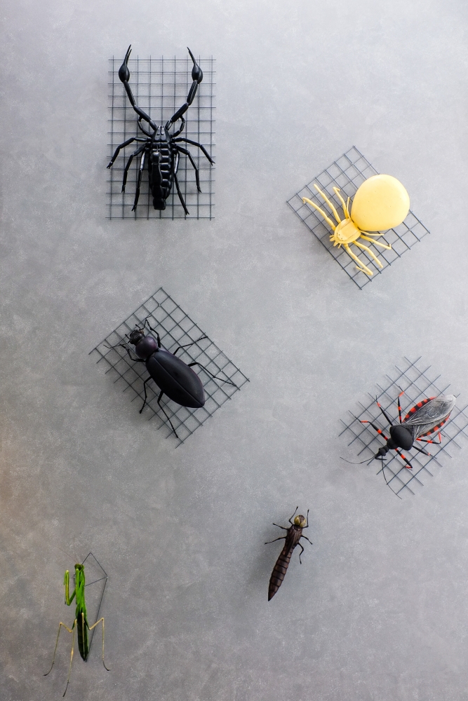 Od góry: skorpion, kwietnik, biegacz, zajadek, nimfa ważki, modliszka